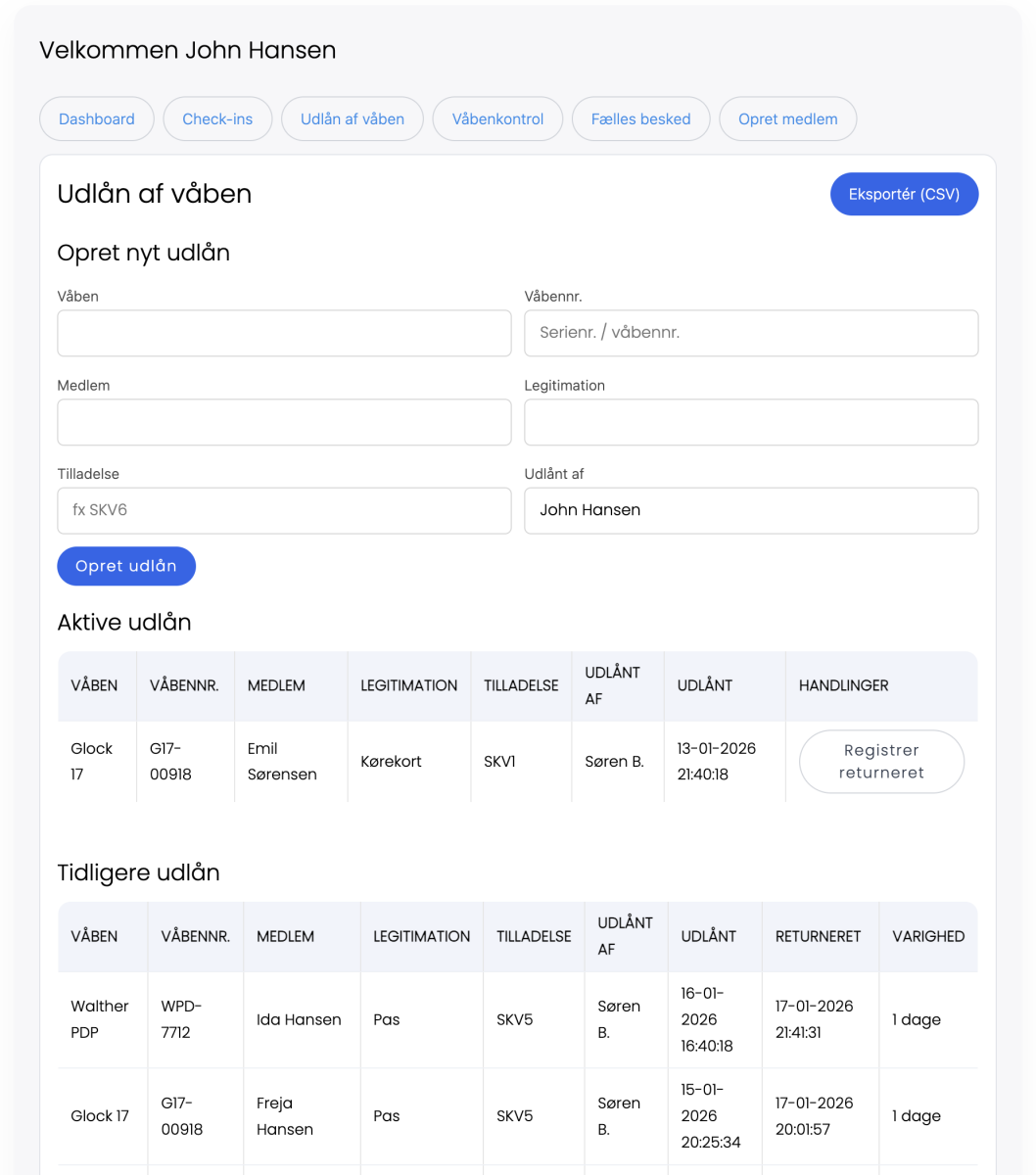 Våbenkontroller samt udlån og tilbagelevering registreres digitalt som en del af klubbens historik